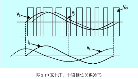 功率因數(shù)控制到1.0實(shí)際上就是設(shè)法使電源電流is與電壓vs同相位。因此,只要讓調(diào)制正弦參考波落后電網(wǎng)電壓vs一個角度,整流器網(wǎng)側(cè)輸出的PWM電壓vcp的基波分量vc落后于vs,使電流is與電壓vs同相,整流器工作在整流狀態(tài),而且功率因數(shù)控制在1.0,如圖3所示。