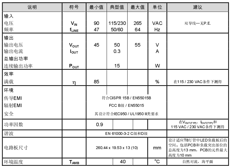 此設計的主要目標是超薄和高效率。這樣有助于使驅(qū)動器板適應T8燈管內(nèi)LED負載板后的空間,并將工作時的溫升保持在可接受的范圍以內(nèi)。為此,必須認真選擇元件和安裝方法,但這相比于方案的更換更加簡單,因為初級側(cè)調(diào)節(jié)的LinkSwitch-PH設計所需的元件數(shù)量很少。