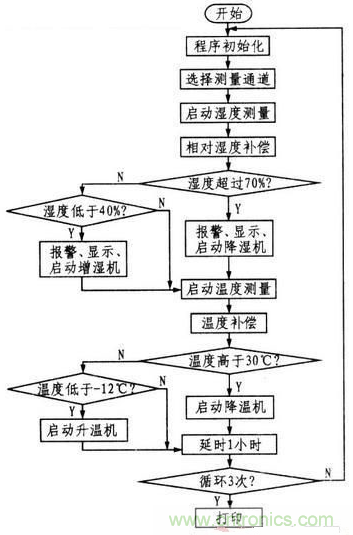 每次測得的數(shù)據(jù)要和規(guī)定值進(jìn)行比較,如果在允許的范圍內(nèi),則程序進(jìn)行下一步操作,如果不滿足要求.則應(yīng)報警并將此刻的數(shù)據(jù)值顯示出來,在每次循環(huán)結(jié)束后。要經(jīng)過1個小時(可以靈活選用)的延時.這主要是因為彈藥倉庫里有很多木制結(jié)構(gòu),揮發(fā)和吸收水分都有一個過程,經(jīng)過一定延時再進(jìn)行測量.可以避免傳感器長時間的工作和執(zhí)行機(jī)構(gòu)的反復(fù)啟停,節(jié)約資源,同時可以延長系統(tǒng)的使用壽命。每經(jīng)過3次(根據(jù)需要可以適當(dāng)選擇)循環(huán)測量后,單片機(jī)控制打印機(jī)將3次測量的溫/濕度數(shù)據(jù)打印出來,便于報表和存檔。