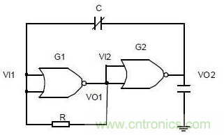 振蕩電路的作用是將電容的變化量轉化為頻率可變的方波。由圖3 可知,這是一個非對稱多諧振蕩器?;蚍情TG1 工作在電壓傳輸特性的轉折區(qū),把它的輸出電壓直接連接到或非門G2 的輸入端。G2即可得到一個介于高低電平之間的靜態(tài)偏置電壓,從而使G2 的靜態(tài)工作點也處于電壓傳輸特性轉折區(qū)上。反饋環(huán)路中電容使電路在兩個暫穩(wěn)態(tài)之間往復振蕩。