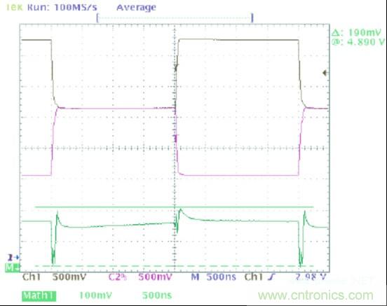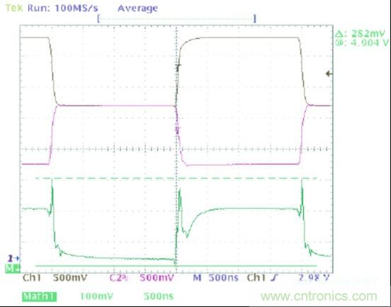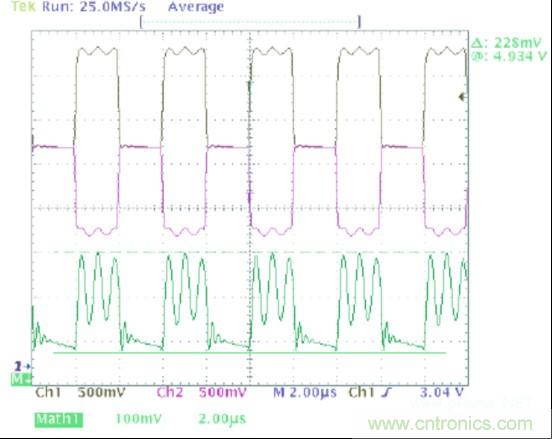 圖1中的波形顯示了一個可以在典型CAN收發(fā)器的輸出上觀察到的共模噪聲。在這幅圖像中,黑色軌跡線(通道1)顯示CANH,紫色軌跡線(通道 2)顯示的是CANL,并且綠色軌跡線(數(shù)據(jù)功能)是CANH與CANL的和。這個求和的過程給出了一個波形,它的值等于此時一個指定點(diǎn)上共模電壓的2 倍。