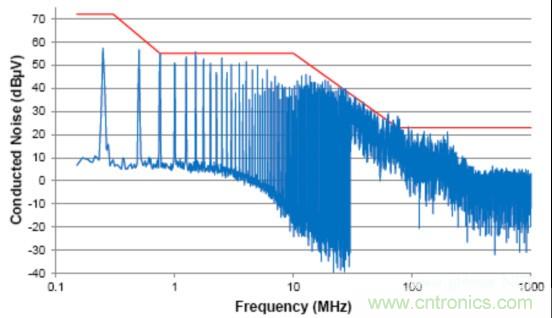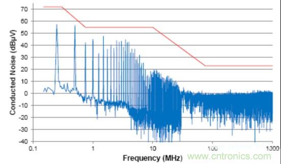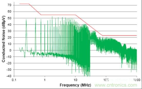 由于信號的共模部分能夠與系統(tǒng)(或與外部系統(tǒng))中的其它分量耦合在一起(通過輻射或傳導(dǎo)路徑),這個共模噪聲直接影響放射性能。這個器件的傳導(dǎo)放射按照工業(yè)電氣工程/電子 (IBEE) 茨維考技術(shù)的工程服務(wù)進(jìn)行測量;如圖2中所示,這個器件的傳導(dǎo)放射連同一個普通汽車原始設(shè)備制造商(OEM)限值線一同繪制。