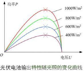 在一定的光照強度和環(huán)境溫度下,光伏電池可以工作在不同的輸出電壓,但是只有在某一輸出電壓值時,光伏電池的輸出功率才能達到最大值,這時光伏電池的工作點就達到了輸出功率電壓曲線的最高點,稱之為最大功率點。如圖2所示為MPPT受光照影響圖、圖 3所示為MPPT受溫度影響圖