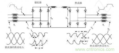 目前運行的大多數(shù)HVDC系統(tǒng)采用LCC拓撲。LCC的效率稍高于VSC,能夠傳輸更大數(shù)量的電力。其典型電壓電平為450kV或500kV;然而,中國有幾條800kV的線路。由于采用脈寬調(diào)制(PWM)技術(shù),LCC不會像VSC那樣出現(xiàn)開關(guān)損耗。LCC使用晶閘管作為開關(guān)裝置。多個晶閘管串聯(lián)成三相整流器的單支線路,即構(gòu)成了所謂的“閥”。