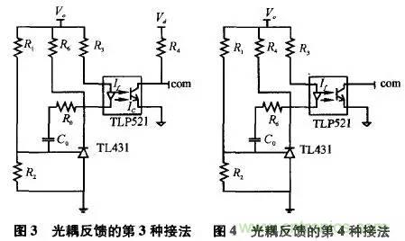常見的光耦反饋第1種接法,如圖1所示。圖中,Vo為輸出電壓,Vd為芯片的供電電壓。com信號接芯片的誤差放大器輸出腳,或者把PWM芯片(如UC3525)的內部電壓誤差放大器接成同相放大器形式,com信號則接到其對應的同相端引腳。注意左邊的地為輸出電壓地,右邊的地為芯片供電電壓地,兩者之間用光耦隔離。圖1所示接法的工作原理如下:當輸出電壓升高時,TL431的1腳(相當于電壓誤差放大器的反向輸入端)電壓上升,3腳(相當于電壓誤差放大器的輸出腳)電壓下降,光耦TLP521的原邊電流If增大,光耦的另一端輸出電流Ic增大,電阻R4上的電壓降增大,com引腳電壓下降,占空比減小,輸出電壓減??;反之,當輸出電壓降低時,調節(jié)過程類似。開關電源中光耦的作用常見的第2種接法,如圖2所示。與第1種接法不同的是,該接法中光耦的第4腳直接接到芯片的誤差放大器輸出端,而芯片內部的電壓誤差放大器必須接成同相端電位高于反相端電位的形式,利用運放的一種特性——當運放輸出電流過大(超過運放電流輸出能力)時,運放的輸出電壓值將下降,輸出電流越大,輸出電壓下降越多。因此,采用這種接法的電路,一定要把PWM芯片的誤差放大器的兩個輸入引腳接到固定電位上,且必須是同向端電位高于反向端電位,使誤差放大器初始輸出電壓為高。圖2所示接法的工作原理是:當輸出電壓升高時,原邊電流If增大,輸出電流Ic增大,由于Ic已經超過了電壓誤差放大器的電流輸出能力,com腳電壓下降,占空比減小,輸出電壓減??;反之,當輸出電壓下降時,調節(jié)過程類似。