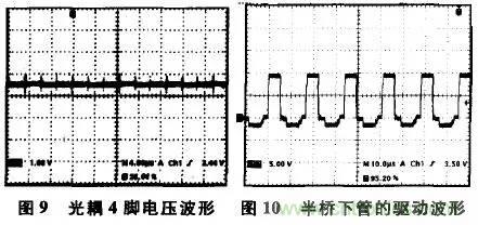 根據上述分析,以下針對不同的典型接法,對比其特性以及適用范圍。本研究以實際的隔離半橋輔助電源及反激式電源為例說明。第1種接法中,接到電壓誤差放大器輸出端的電壓是外部電壓經電阻R4降壓之后得到,不受電壓誤差放大器電流輸出能力影響,光耦的工作點選取可以通過其外接電阻隨意調節(jié)。按照前面的分析,令電流If的靜態(tài)工作點值大約為10mA,對應的光耦工作溫度在0~100℃變化,值在20~15mA之間。一般PWM芯片的三角波幅值大小不超過3V,由此選定電阻R4的大小為670Ω,并同時確定TL431的3腳電壓的靜態(tài)工作點值為12V,那么可以選定電阻R3的值為560Ω。電阻R1與R2的值容易選取,這里取為27k與4.7k。電阻R5與電容C1為PI補償,這里取為3k與10nF。實驗中,半橋輔助電源輸出負載為控制板上的各類控制芯片,加上多路輸出中各路的死負載,最后的實際功率大約為30w。實際測得的光耦4腳電壓(此電壓與芯片三角波相比較,從而決定驅動占空比)波形,如圖9所示。對應的驅動信號波形,如圖10所示。圖10的驅動波形有負電壓部分,是由于上、下管的驅動繞在一個驅動磁環(huán)上的緣故??梢钥闯觯寗有盘柕恼伎毡缺容^大,大約為0.7。