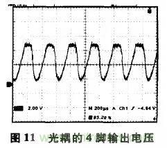 同樣,對于上面的半橋輔助電源電路,用接法2代替接法1,閉環(huán)不穩(wěn)定,用示波器觀察光耦4腳電壓波形,有明顯的振蕩。光耦的4腳輸出電壓(對應于UC3525的誤差放大器輸出腳電壓),波形如圖11所示,可發(fā)現(xiàn)明顯的振蕩。這是由于這個半橋電源穩(wěn)態(tài)占空比比較大,按接法2則光耦增益大,系統(tǒng)不穩(wěn)定而出現(xiàn)振蕩。