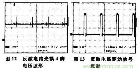 以下是另外一個實驗反激電路,工作在斷續(xù)模式,實際測得其光耦4腳電壓波形,如圖12所示。實際測得的驅動信號波形,如圖13所示,占空比約為0.2。