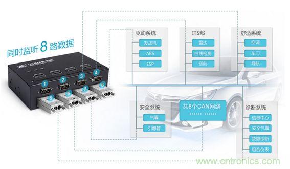 若將每個(gè)節(jié)點(diǎn)單獨(dú)取出做測試,則必然破壞原有通信規(guī)則。如何在不破壞原有通信的基礎(chǔ)上搞清楚一個(gè)陌生的收發(fā)協(xié)議呢?所謂工欲善其事,必先利其器。您需要一個(gè)能同時(shí)收發(fā)、轉(zhuǎn)送多路CAN數(shù)據(jù)的CAN卡,USBCAN-8E-U正是為這種應(yīng)用而生。