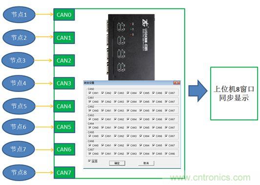USBCAN-8E-U集成8路CAN-bus接口,各通道間可做路由(轉(zhuǎn)發(fā))功能。在識別節(jié)點(diǎn)ID時(shí),可以將節(jié)點(diǎn)同時(shí)接到8個(gè)CAN接口上,然后設(shè)置8路CAN間通信自由轉(zhuǎn)發(fā),保證原有網(wǎng)絡(luò)通信規(guī)則不受破壞。強(qiáng)大的上位機(jī)軟件將每個(gè)通道發(fā)送、接收的CAN報(bào)文按通道分開顯示,數(shù)據(jù)分析一目了然。