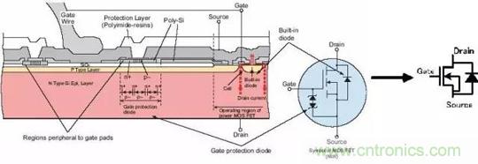 至于為什么不使用耗盡型的MOS管,不建議刨根問底。對于這兩種增強型MOS管,比較常用的是NMOS。原因是導(dǎo)通電阻小且容易制造。所以開關(guān)電源和馬達驅(qū)動的應(yīng)用中,一般都用NMOS。下面的介紹中,也多以NMOS為主。在MOS管原理圖上可以看到,漏極和源極之間有一個寄生二極管。這個叫體二極管,在驅(qū)動感性負載(如馬達),這個二極管很重要。順便說一句,體二極 管只在單個的MOS管中存在,在集成電路芯片內(nèi)部通常是沒有的。下圖是MOS管的構(gòu)造圖,通常的原理圖中都畫成右圖所示的樣子。 (柵極保護用二極管有時不畫)