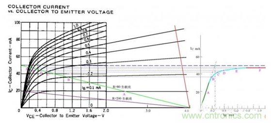 圖中假定電源電壓為4V,綠色的斜線是負(fù)載電阻為80歐姆的負(fù)載線,V/R=50MA,圖中標(biāo)出了Ib分別等于0.1、0.2、0.3、0.4、0.6、1.0mA的工作點(diǎn)A、B、C、D、E、F。據(jù)此在右側(cè)作出了Ic與Ib的關(guān)系曲線。根據(jù)這個(gè)曲線,就比較清楚地看出“飽和”的含義了。曲線的綠色段是線性放大區(qū),Ic隨Ib的增大幾乎成線性地快速上升,可以看出β值約為200。蘭色段開始變彎曲,斜率逐漸變小。紅色段就幾乎變成水平了,這就是“飽和”。實(shí)際上,飽和是一個(gè)漸變的過程,蘭色段也可以認(rèn)為是初始進(jìn)入飽和的區(qū)段。在實(shí)際工作中,常用Ib*β=V/R作為判斷臨界飽和的條件。在圖中就是假想綠色段繼續(xù)向上延伸,與Ic=50MA的水平線相交,交點(diǎn)對應(yīng)的Ib值就是臨界飽和的Ib值。圖中可見該值約為0.25mA。