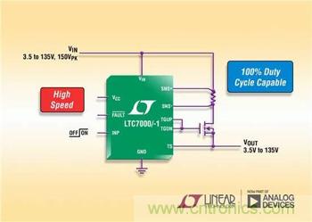 LTC7000是一款快速、高壓側(cè) N 溝道 MOSFET 柵極驅(qū)動(dòng)器,主要接收一個(gè)參考于地的低電壓數(shù)字輸入信號,并以 35ns 的傳播延遲完全接通或關(guān)斷一個(gè)其漏極可高出地電位達(dá) 135V 的高壓側(cè) N 溝道 MOSFET。13ns的快速上升和下降時(shí)間 (當(dāng)驅(qū)動(dòng)一個(gè) 1000pF 負(fù)載) 最大限度降低了