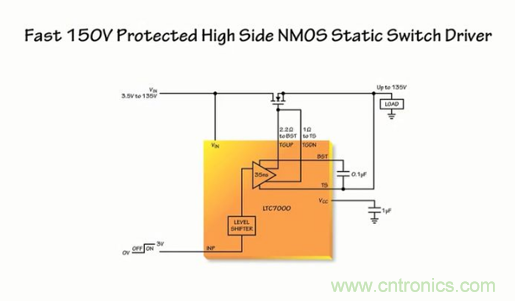 LTC7000 在 INP 引腳上接收一個(gè)參考于地的低電壓數(shù)字信號、把該信號電平移位至高達(dá) VIN 電壓。并控制片內(nèi)低阻抗上拉和下拉器件,能快速接通或判斷一個(gè)其漏極可高出地電位達(dá) 135V 的高壓側(cè) N 溝道 MOSFET。從低電壓 INP 信號至得到全面強(qiáng)化或被完全關(guān)斷的 N 溝道 MOSFET 之傳播延遲約為 35ns,這也促成了許多應(yīng)用。