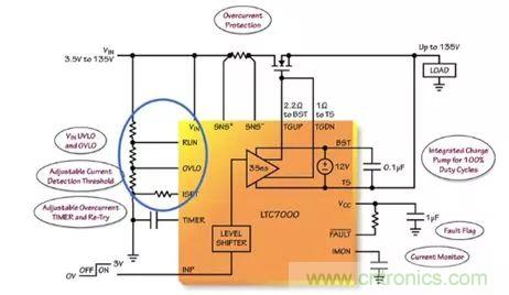 LTC7000 能夠避免負(fù)載遭受 VIN 引腳上的過壓和欠壓情況的損壞。“一個(gè)連接在 VIN 和地之間、且抽頭連接至 RUN 和 OVLO 引腳的簡單電阻分壓器將設(shè)定一個(gè)針對負(fù)載的有效操作窗口。當(dāng) VIN 位于由 RUN 和 OVLO 引腳所設(shè)定的操作窗口之外時(shí),則關(guān)斷外部 MOSFET,并保護(hù)負(fù)載免遭潛在損壞或發(fā)生故障。” Mark Mullen這樣談到。