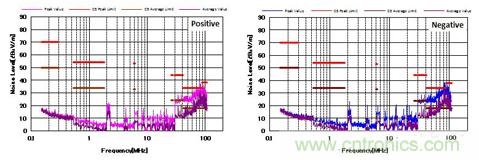 圖3顯示了增加一個(gè)DM濾波器后的EMI結(jié)果。 從圖中可以看出,DM濾波器衰減了中頻段DM噪聲(2MHz至30MHz)近35dBμV/ m。此外高頻段噪聲(30MHz至100MHz)也有所降低,但仍超過限制水平。這主要是因?yàn)镈M濾波器對于高頻段CM噪聲的濾除能力有限。