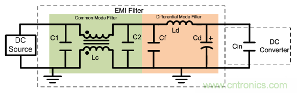 圖1是一個(gè)簡化的EMI濾波器,包括共模(CM)濾波器和差模(DM)濾波器。 通常,DM濾波器主要用于濾除小于30MHz的噪聲(DM噪聲),CM濾波器主要用于濾除30MHz至100MHz的噪聲(CM噪聲)。 但其實(shí)這兩個(gè)濾波器對于整個(gè)頻段的EMI噪聲都有一定的抑制作用。