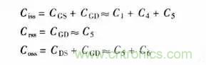 (3)C2+C4代表從柵極到源極P區(qū)間的電容。C2是電介質電容,共值是固定的。而C4是由源極到漏極的耗盡區(qū)的大小決定,并隨柵極電壓的大小而改變。當柵極電壓從0升到開啟電壓UGS(th)時,C4使整個柵源電容增加10%~15%。