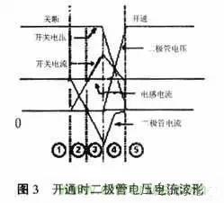 開關管的開關模式電路如圖2所示,二極管可是外接的或MOS管固有的。開關管在開通時的二極管電壓、電流波形如圖3所示。