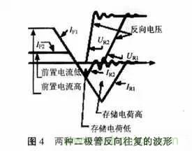 圖4是存儲電荷高或低的兩種二極管電流、電壓波形。從圖中可以看出存儲電荷少時,反向電壓的斜率大,并且會產(chǎn)生有害的振動。而前置電流低則存儲電荷少,即在空載或輕載時是最壞條件。所以進行優(yōu)化驅動電路設計時應著重考慮前置電流低的情況,即空載或輕載的情況,應使這時二極管產(chǎn)生的振動在可接受范圍內。