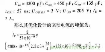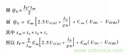 UGS第一段是快速上升到門限電壓;UGS第二段是比較緩的上升速度以減慢漏極電流的上升速度,但此時的UGS也必須滿足所需的漏極電流值;UGS第四段快速上升使漏極電壓快速下降;UGS第五段是充電到最后的值。當然,要得到完全一樣的驅動波形是很困難的,但是可以得到一個大概的驅動電流波形,其上升時間等于理想的漏極電壓下降時間或漏極電流上升的時間,并且具有足夠的尖峰值來充電開關期間的較大等效電容。該柵極尖峰電流IP的計算是:電荷必須完全滿足開關時期的寄生電容所需。