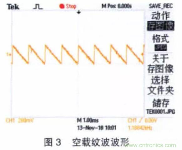 圖3 所示為空載時MAX606 輸出電壓紋波波形(Uo≈12 V),即開關(guān)紋波,其頻率為1.18 kHz,波形穩(wěn)定,Vpp=240 mV。圖4 所示為負載120 Ω 時輸出電壓的紋波波形,從圖4 中可以看出加入負載后電源紋波變得比較復(fù)雜,其最高Vpp達到1.2 V。為系統(tǒng)供電時,該紋波將會對系統(tǒng)造成嚴重危害,必須對此紋波進行抑制。