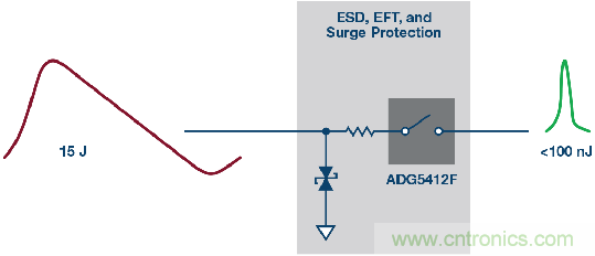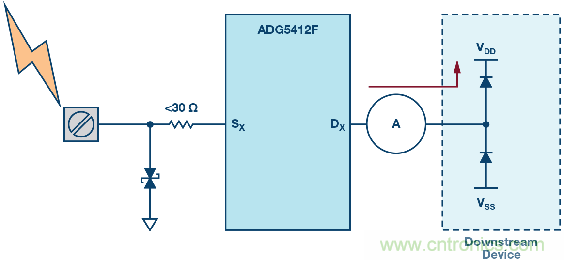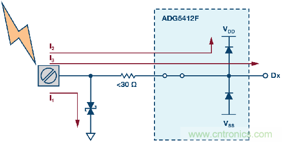 圖4也展示了高壓瞬變事件過程中的各種電流路徑。大部分電流通過TVS器件分流到地(路徑I1)。路徑I2展示的是通過ADG5412F輸出節(jié)點(diǎn)上的內(nèi)部ESD消耗的電流,同時,輸出電壓被箝位于比電源電壓高0.7 V的水平。最后,路徑I3中的電流是下游器件必須承受的剩余電流水平。有關(guān)該保護(hù)電路的更多詳情,請參閱ADI公司應(yīng)用筆記AN-1436。