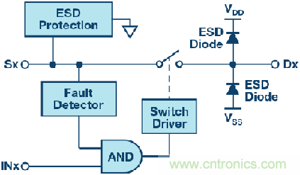 圖2顯示了一個典型過壓保護(hù)開關(guān)的功能框圖;注意,該開關(guān)的ESD保護(hù)二極管未以其輸入節(jié)點(diǎn)上的電源電壓為基準(zhǔn)。相反,它有一個ESD保護(hù)單元,在超過器件最大承受電壓時激活,使器件能承受并阻斷超過其電源電壓的電壓。由于模擬系統(tǒng)通常只要求開關(guān)的外向引腳采用IEC保護(hù),所以,ESD保護(hù)二極管依然保留在內(nèi)向引腳上(標(biāo)志為開關(guān)輸出端或漏極端)。這些二極管能帶來額外的好處,因?yàn)樗鼈兤鸬捷o助保護(hù)器件的作用。在持續(xù)時間較短、上升時間快的高壓瞬變(如ESD或EFT)過程中,由于瞬變電壓會被箝位,所以電壓不會到達(dá)下游電路。在持續(xù)時間較長、上升時間慢的高壓瞬變(如浪涌)過程中,在開關(guān)過壓保護(hù)功能被激活、開關(guān)斷開、使故障完全與下游電路分離之前,內(nèi)部保護(hù)二極管會箝位開關(guān)的輸出電壓。