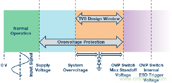 圖3顯示了一個與外部接口的系統(tǒng)輸入端的工作區(qū)域。最左邊的區(qū)域(綠色)表示正常工作區(qū)間,輸入電壓位于電源電壓范圍以內(nèi)。左起第二個區(qū)域(藍(lán)色)表示輸入端可能存在持續(xù)直流或長時間交流過壓的范圍,原因是斷電、接線錯誤或短路。另外,圖中最右側(cè)(紫色)是過壓開關(guān)內(nèi)部ESD保護(hù)二極管的觸發(fā)電壓。選擇的TVS擊穿電壓(橙色)必須小于過壓保護(hù)開關(guān)的最大承受電壓并且大于任何已知的可能持續(xù)直流或長時間交流過壓,以免無意中觸發(fā)TVS。