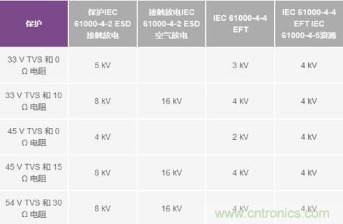 表1. 測試結(jié)果(未在0 Ω電阻與33 V TVS及45 V TVS組合條件下進(jìn)行IEC空氣放電測試)