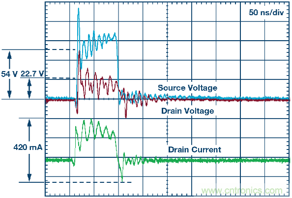 圖7. 16 kV空氣放電事件期間的漏極電壓和漏極輸出電流。