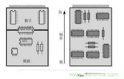 上面的兩種情況,說明數(shù)?;旌蠁伟逯?,模擬電路極易受到干擾,會影響信噪比等指標。所以在數(shù)模混合單板 PCB 設計過程中,要對布局布線提出很高的要求。