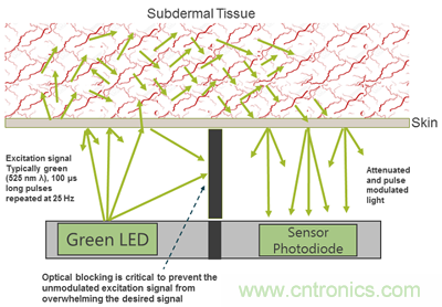 圖1展示了測量心率信號的基本方法,它依賴于用光學(xué)方法從人體組織上提取的心率壓力波。圖1說明了光進入皮膚后傳輸?shù)耐緩剑河尚穆蕢毫Σㄒ鸬拿氀苁鎻埡褪湛s運動對由綠色LED注入人體組織的光信號進行了調(diào)制。接收到的信號因為通過了皮膚而被大大地衰減,它被一個光電管接收并送到電子子系統(tǒng)中去處理。源自脈搏的振幅調(diào)制信號被檢測(過濾掉運動噪聲)、分析和顯示。