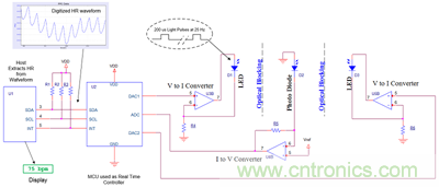 心率監(jiān)測系統(tǒng)設(shè)計的一種基本方法采用了一種定制的的微控制器(MCU),它被用于控制外部LED驅(qū)動器的脈沖信號發(fā)生,并同時讀取一個分離的光電管上的電流輸出數(shù)據(jù)。已知光電管的電流輸出必須轉(zhuǎn)換為電壓,輸出給模擬到數(shù)字轉(zhuǎn)換(A/D)單元,圖2中的原理圖說明了這類系統(tǒng)的基本原理。已知電流到電壓轉(zhuǎn)換器在光電管電流為0時產(chǎn)生一個等于VREF的電壓,而隨著電流的增加電壓將下降。
