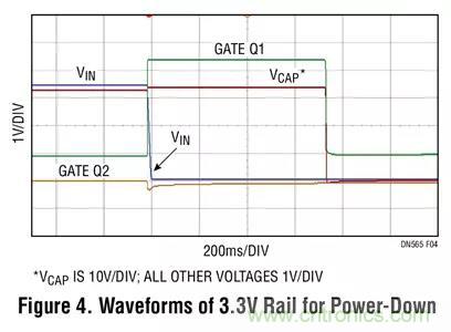 圖 4 示出了失去 3.3V 電壓軌時的波形。當輸入電壓下降時,Q2 的柵極電壓保持不變 (接近于地電位),而且 Q2 處于關(guān)斷狀態(tài)。與此相反,Q1 的柵極電壓則急劇上升至 3.3V。這把 Q1 關(guān)斷,由 Q1 的體二極管起隔離二極管的作用,從而使負載與輸入分離。此時備份電源接管供電,LTC3643 通過釋放存儲電容器的電能以給關(guān)鍵的負載提供3.3V。