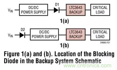 LTC3643 可容易地適用于 5V 和 12V 電壓軌的備份解決方案,但是 3.3V 電壓軌解決方案則需要格外謹慎。LTC3643 的最小工作電壓為 3V,比較接近于 3.3V 的標稱輸入電壓電平。如圖 1a 所示,當采用一個隔離二極管以使備份電壓電源與非關(guān)鍵的電路分離時,這種余量就太嚴緊了。如果 D1 是一個肖特基二極管,其正向壓降 (作為負載電流和溫度之函數(shù)) 會達到 0.4V 至 0.5V,足以把 LTC3643 VIN 引腳上的電壓置于 3V 最小值以下。因此,備份電源電路可能無法啟動。