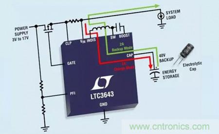 在這里提及的備份電源或保持電源中,當電源存在時,LTC3643 把存儲電容器充電至 40V,而當電源中斷時,LTC3643 則把該存儲電容器的電能釋放給關(guān)鍵的負載。負載 (輸出) 電壓可設(shè)置為介于 3V 和 17V 之間的任何電壓。
