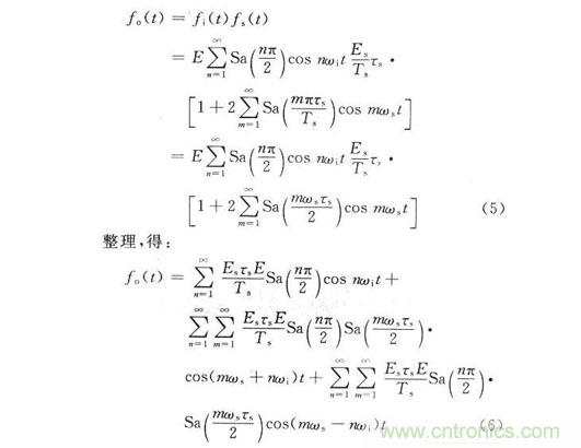 式中:E,ωi分別為輸入信號(hào)的幅度和角頻率。設(shè)采樣脈沖信號(hào)為fs(t),采樣后的信號(hào)為fo(t),則采樣過(guò)程在時(shí)域上的數(shù)學(xué)表示式為fo(t)=fi(t)fs(t),在DRFM中采用等間隔均勻采樣,采樣周期為T(mén)s,采樣時(shí)鐘頻率ωs=2πfs。在實(shí)際電路中,采樣是在采樣脈沖上升的瞬間完成的。因此采樣脈沖的寬度可以看成一個(gè)窄脈寬,用τs。來(lái)表示。采樣脈沖的傅里葉級(jí)數(shù)為:
