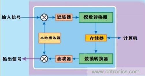 如下圖所示,數(shù)字射頻存儲(chǔ)器可以將接收信號(hào)轉(zhuǎn)換為中頻(IF)信號(hào)。然后將中頻信號(hào)的帶寬數(shù)字化。數(shù)字化信號(hào)被存儲(chǔ)在存儲(chǔ)器中傳輸?shù)接?jì)算機(jī)。計(jì)算機(jī)對(duì)信號(hào)進(jìn)行必要的分析和修正,使其滿(mǎn)足干擾技術(shù)需求。