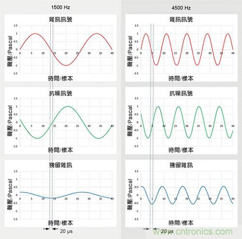 前饋降噪帶寬,在低頻處被耳機驅(qū)動模塊限制在50Hz左右,在高頻處被聲學(xué)結(jié)構(gòu)和訊號處理延遲限制于3kHz。延遲會導(dǎo)致難以在抗噪訊號和噪聲訊號之間實現(xiàn)180度的相位反轉(zhuǎn),高頻部份因為波長較短更難處理。圖2顯示了兩種頻率下20μs延遲對降噪效果的影響:頻率為1500Hz時,殘余噪聲約剩1/5(14dB ANC),但頻率為4500Hz時,即使延遲不變,殘余噪聲也已增加到3/5(僅4dB ANC)。