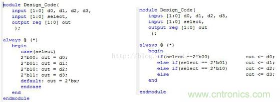 設(shè)計一個二位4路選擇器,由于選擇器使用條件觸發(fā)的方法對應(yīng)真值表進(jìn)行匹配輸出與輸入,因此可以聯(lián)想到在C程序設(shè)計中的條件語句“If”和“Case”兩種,那么這兩種設(shè)計從硬件的角度出發(fā)有什么不同呢?