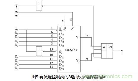也可以添加使能控制端對所接成的8選1數(shù)據(jù)選擇器的工作狀態(tài)進(jìn)行控制。添加使能控制端的8選1數(shù)據(jù)選擇器的電路如圖5所示。