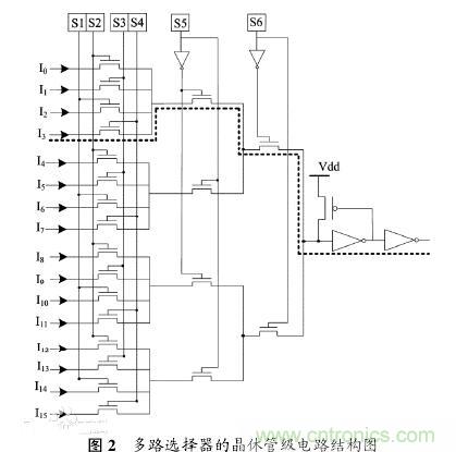 多路選擇器的左邊是 16 條輸入線,用于連接布線軌道或可編程邏輯塊等資源,S1~S6 代表 6 個可編程SRAM 單元,通過配置 SRAM 單元的內(nèi)容可以從 16條輸入線中選出 1 條作為有效輸入端,例如,當(dāng) S1~S6存儲單元的存儲值為“000100”時,輸入線 I3被選擇中,信號所經(jīng)過的有效路徑如圖 2 中虛線所示。多路選擇器的主體部分是傳輸晶體管,由于 NMOS 晶體管載流子的遷移效率高,電路速度快,因此,多路選擇器中的傳輸晶體管均采用 NMOS 晶體管實現(xiàn)。
