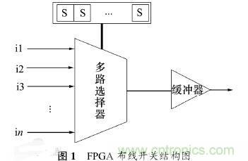 在FPGA各種資源中,可編程邏輯塊是實現(xiàn)用戶功能的基本單元,每個可編程邏輯塊包含1個互連開關(guān)矩陣和4個SLICEs,其中每個SLICE包括2個查找表(Look-Up-Table,LUT)、2個觸發(fā)器和一些多路選擇器?;ミB開關(guān)矩陣主要由不同長度導(dǎo)線和多個布線開關(guān)組成,典型的布線開關(guān)結(jié)構(gòu)如圖1所示。