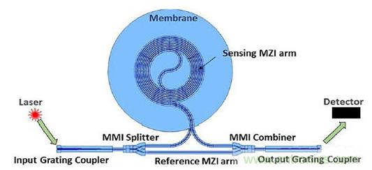 在功能上,從MZI發(fā)出的光強(qiáng)取決于兩個(gè)臂之間的相位差及其所承受的差壓。由于其中一個(gè)臂比另一個(gè)長(zhǎng)得多,MZI是“不平衡的”。