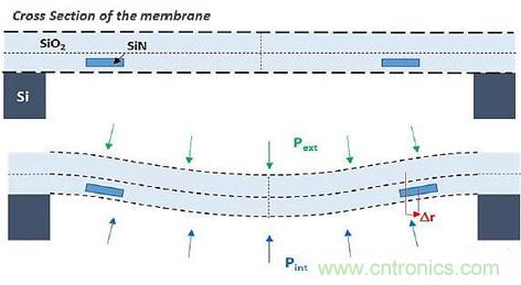 圖2:在這個(gè)微型光學(xué)壓力傳感器橫截面中,下半部分顯示了壓力下的彎曲。