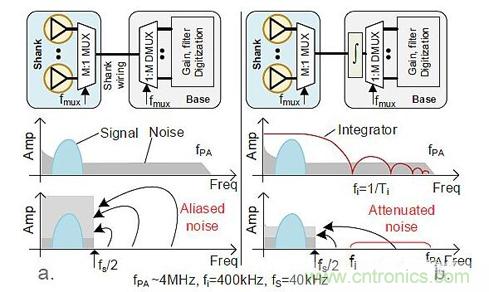 神經(jīng)探針的信號(hào)帶寬約為7.5kHz,可以采用15kHz對(duì)PA輸出采樣。設(shè)計(jì)人員發(fā)現(xiàn)可以將時(shí)分復(fù)用技術(shù)嵌入柄中(圖4a)。這樣做可以使每個(gè)獨(dú)特的柄線上有M個(gè)PA輸出。如果沒(méi)有加抗混疊濾波器進(jìn)行限制,則PA帶寬會(huì)由于折疊而產(chǎn)生帶內(nèi)噪聲。在采樣發(fā)生之前,將低通濾波器裝入這個(gè)小PA區(qū)域是不可能的。設(shè)計(jì)人員選擇使用能夠在Ti時(shí)間段對(duì)信號(hào)進(jìn)行積分的架構(gòu)(圖4b)來(lái)衰減超出采樣頻率fi的信號(hào),從而提高信噪比(SNR)。