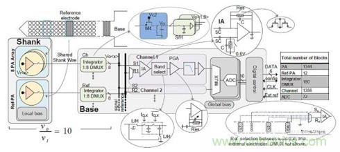 探針架構(gòu)設(shè)計(jì)(圖5)中的信號(hào)流,通過(guò)一條共享柄線從8個(gè)多路復(fù)用PA陣列的輸出流向底座。然后,該信號(hào)進(jìn)入探針底座中的積分器,積分器的輸出通過(guò)8個(gè)標(biāo)記為Vo的采樣保持電路進(jìn)行解復(fù)用。接下來(lái),8個(gè)單獨(dú)的Vo中的每一個(gè)都進(jìn)入自己的信道模塊,它們對(duì)信號(hào)進(jìn)行放大和濾波,使得輸出僅有感興趣的頻帶。接下來(lái),所有20個(gè)通道經(jīng)過(guò)多路復(fù)用并由10位逐次逼近寄存器式(SAR)模數(shù)轉(zhuǎn)換器(ADC)進(jìn)行數(shù)字化,并發(fā)送至為ADC和多路復(fù)用/多路解復(fù)用器(MUX/DEMUX)提供時(shí)鐘的數(shù)字控制模塊。在此,所有ADC的并行輸出經(jīng)串行化后僅有6條數(shù)據(jù)線。