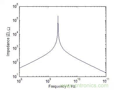 同樣可以得到一個典型的電容器的阻抗絕對值與頻率的關(guān)系。如下圖所示,由于存在介質(zhì)損耗和有限長的引線,電容顯示出與電阻同樣的諧振特性。