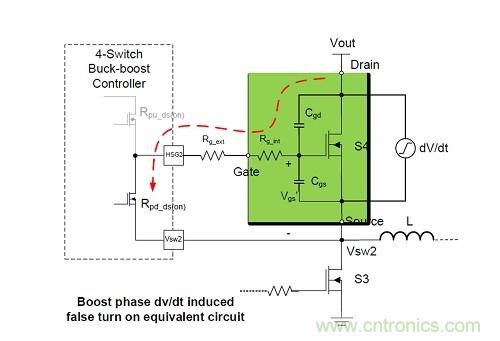 然后,這一問(wèn)題在4開(kāi)關(guān)降壓-升壓轉(zhuǎn)換器中翻了一番,因?yàn)樗袃蓚€(gè)階段——降壓和升壓。當(dāng)設(shè)計(jì)人員直接將降壓轉(zhuǎn)換器的電路參數(shù)復(fù)制到4開(kāi)關(guān)降壓-升壓轉(zhuǎn)換器的升壓段時(shí),就會(huì)產(chǎn)生錯(cuò)誤。隨著這種拓?fù)浣Y(jié)構(gòu)在應(yīng)用中越來(lái)越受歡迎,了解dv/dt電感導(dǎo)通問(wèn)題變得越來(lái)越重要。